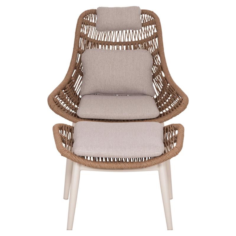Ο σκελετός από αλουμίνιο σε ανοιχτή μπεζ απόχρωση εξασφαλίζει ανθεκτικότητα και σταθερότητα, ενώ η επένδυση από twist wicker σε φυσικό χρώμα προσδίδει ζεστασιά και διαχρονική αισθητική. Τα άνετα μαξιλάρια καθίσματος, πλάτης και προσκέφαλου, καθώς και το μαξιλάρι του υποποδίου, σε ανοιχτό μπεζ OLEFIN ύφασμα, προσφέρουν εξαιρετική άνεση για πολύωρη χρήση.