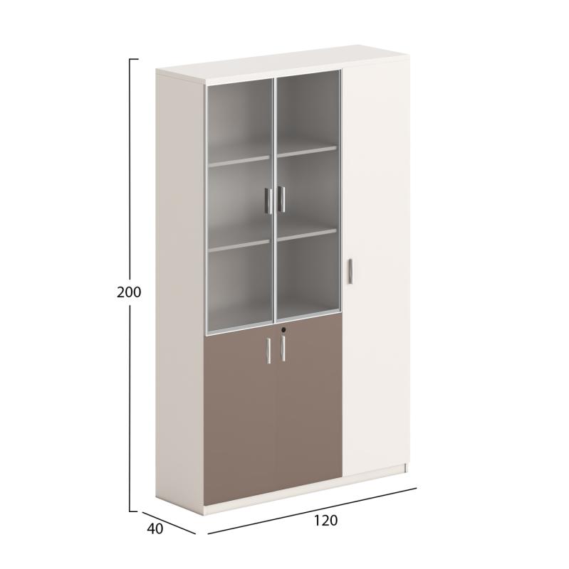 Στο επάνω μέρος διαθέτει γυάλινες πόρτες που κλείνουν δύο ράφια, ιδανικά για προβολή βιβλίων, φακέλων ή διακοσμητικών στοιχείων. Το κάτω μέρος φέρει πόρτες σε ανοιχτό καφέ χρώμα με κλειδαριά, οι οποίες κλείνουν ένα ράφι, προσφέροντας ασφάλεια για έγγραφα και προσωπικά αντικείμενα. Η δεξιά πλευρά, όπως την κοιτάς, αποτελείται από ένα στενό ντουλάπι με ράφια αυξάνοντας την χωρητικότητα του επίπλου.