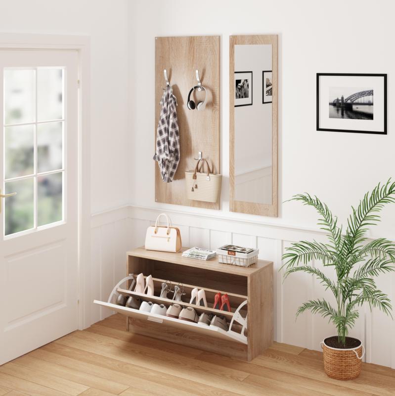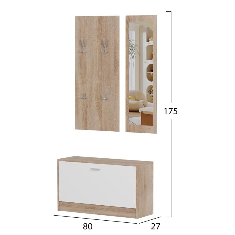 Το έπιπλο εισόδου VERN αποτελείται από 3 κομμάτια. Μία κλασική παπουτσοθήκη με ΛΕΥΚΗ πόρτα, μία κατασκευή με κρεμάστρες ως βεστιάριο αναρτημένη στον τοίχο και ένας καθρέπτης δίπλα από τις κρεμάστρες. Ένα σετ μελαμίνης σε εντυπωσιακό χρώμα SONAMA-ΛΕΥΚΟ που θα σας ενθουσιάσει με την πρακτικότητα του, μιας και το κάθε κομμάτι είναι ανεξάρτητο και μπορεί να τοποθετηθεί οπουδήποτε σας βολεύει καλύτερα.