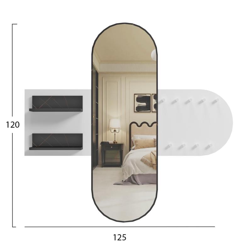 Η κρεμάστρα εισόδου με καθρέφτη CHERYL διαθέτει 9 κρεμάστρες ως βεστιάριο στην μια πλευρά του οβάλ καθρέφτη, και 2 ραφάκια σε χρώμα ΜΑΥΡΟΥ ΜΑΡΜΑΡΟΥ στην άλλη πλευρά. Όλο το έπιπλο είναι από μελαμίνη σε ΛΕΥΚΟ.