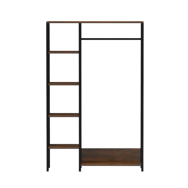 Το επιδαπέδιο έπιπλο εισόδου σε στυλ ανοιχτής ντουλάπας ARANJA είναι σχετικά μικρό σε διαστάσεις αλλά η πρακτικότητά του θα σας εκπλήξει ευχάριστα. Διαθέτει 4 τετράγωνα ραφάκια στην μια πλευρά, ενώ στην άλλη υπάρχει μια μπάρα κρέμασης ρούχων με ένα παταράκι στο κάτω μέρος για παπούτσια. Ο σκελετός είναι μεταλλικός σε ΜΑΥΡΟ χρώμα, ενώ τα ραφάκια είναι από μελαμίνη σε χρωματισμό ΚΑΦΕ ρουστίκ.