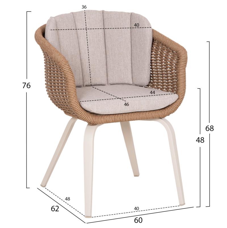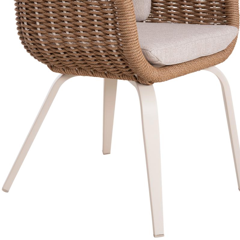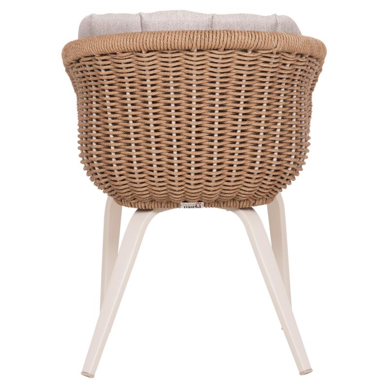 Τα μαλακά μαξιλάρια καθίσματος και πλάτης σε ανοιχτό μπεζ ενισχύουν την άνεση, δημιουργώντας μια φιλόξενη αίσθηση για καθημερινή χρήση σε τραπεζαρία κήπου ή βεράντας.